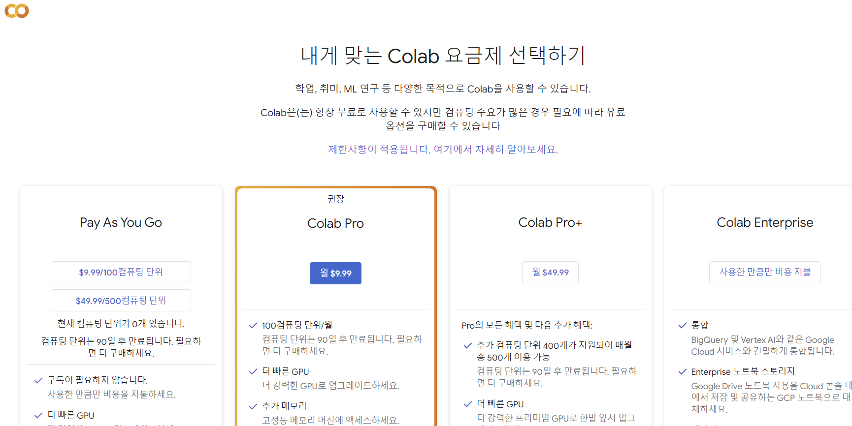 돈내고 컴퓨팅 시간을 사야한다.... 월 비용이..아래와 같다. 그리고 컴퓨팅 시간을 사는 것인데, 이게 생각보다 오래 사용하지 못하고 계속 제한이 걸리는 모양이다.