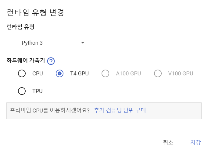 다음으로 런타임을 변경한다. 런타임 > 런타임 유형 변경 > 바로 다음 화면에 GPU 선택.