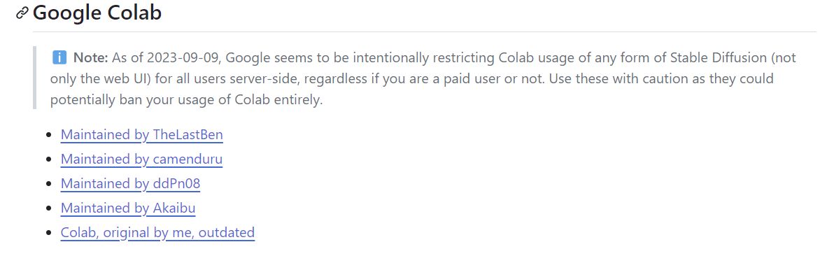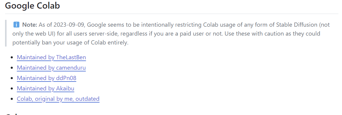 네, 2023년 9월 9일부터 Google은 유료 사용자 여부에 관계없이 모든 사용자의 서버 측에서 Stable Diffusion의 모든 형태(웹 UI만이 아님)를 사용하는 Colab을 의도적으로 제한하는 것으로 보입니다. 이들을 주의해서 사용하십시오. 완전히 Colab 사용을 금지할 수 있습니다.