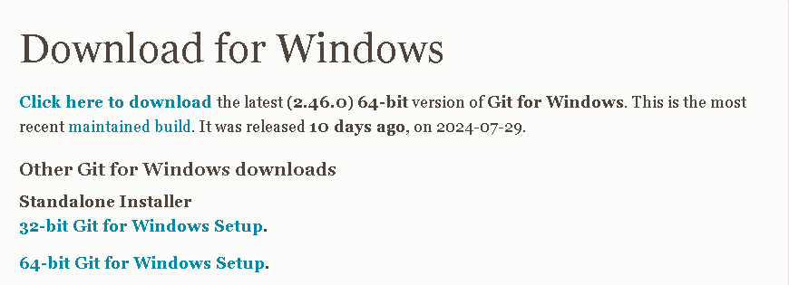 경로: Git - Downloading Package (git-scm.com) 아래의 그림처럼 Standalone Installer 64bit 용 선택